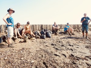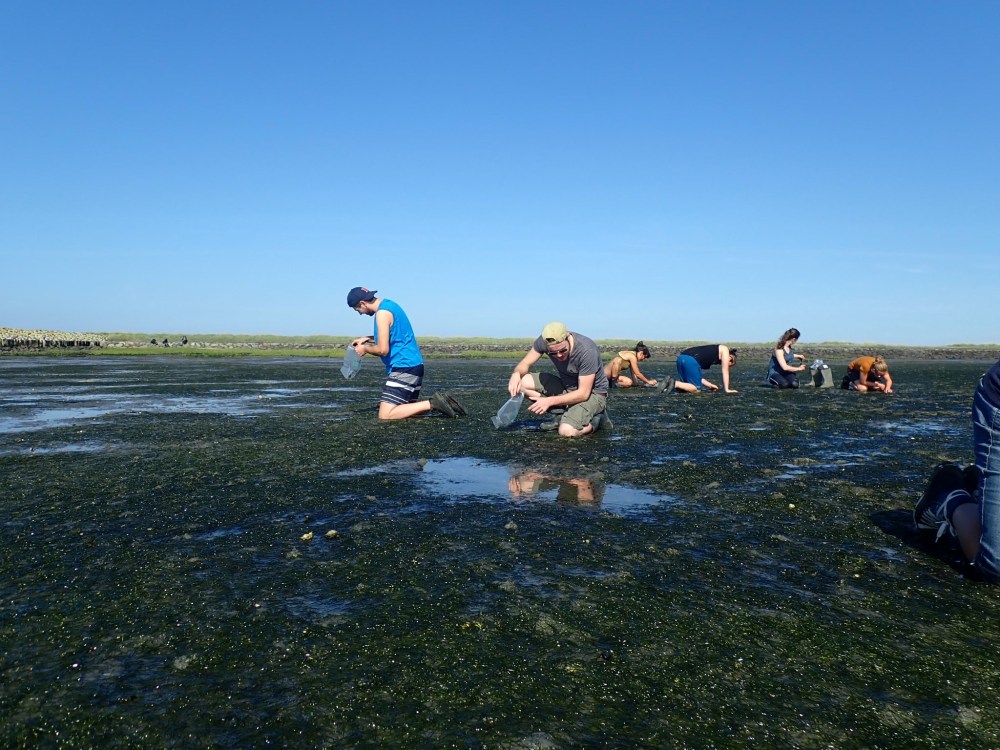 Om volgend jaar op experimentele schaal klein zeegras te kunnen zaaien (in plaats van een ‘proof of principle experiment’) wilden we dit jaar dus meer zaad verzamelen. Dit betekende een heel tij op de knieën speuren naar de schaarse zaadstengels, te herkennen aan lichte, geelgroene verdikkingen aan de bladbasis. In plaats van met vuilniszakken, kroop iedereen met een handzaam zakje op handen en voeten door de modder. Het resultaat: 5 kg klein zeegras. Hopelijk levert dit een paar eetlepels zaad op voor volgend jaar. Al met al dus een geslaagde oogst van zowel groot als klein zeegraszaad dankzij de enthousiaste inzet van een gemêleerd plukteam met wel zes nationaliteiten. Dat is alvast een geslaagde start voor het groeiseizoen van volgend jaar.